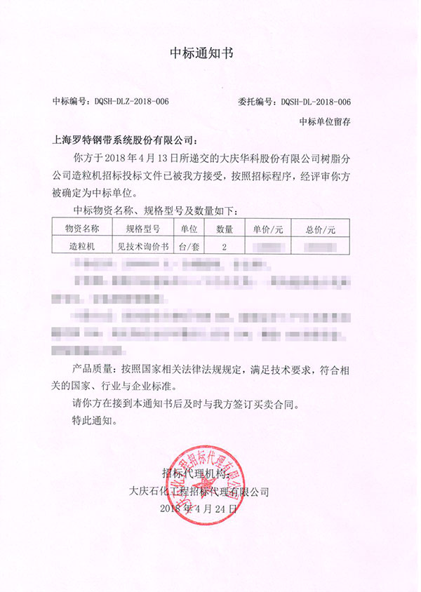 В апреле 2018 года, после ожесточенных торгов с несколькими подразделениями, Shanghai Rott Steel Steel Systems Co., Ltd. успешно выиграла тендер на проект гранулятора смолы нефти филиала Daqing Huake Co., Ltd.