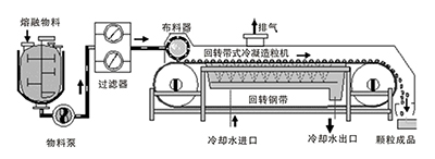 гранулятор ротера использует расплавленный жидкий парафин из резервуара через материальный насос и фильтр, чтобы добраться до распределителя, распределитель через специальную грануляционную ткань расплавленный жидкий парафин в капли в виде капель, капающий в ряд на охлаждающей стальной ленте, работающей с равномерной скоростью под ним, под охлаждающей стальной лентой распыляется охлаждающая вода, капли парафина над стальной лентой охлаждаются, отверждаются в плоские полушария частицы, скребки для сброса, впадают в бункер для достижения цели грануляции.